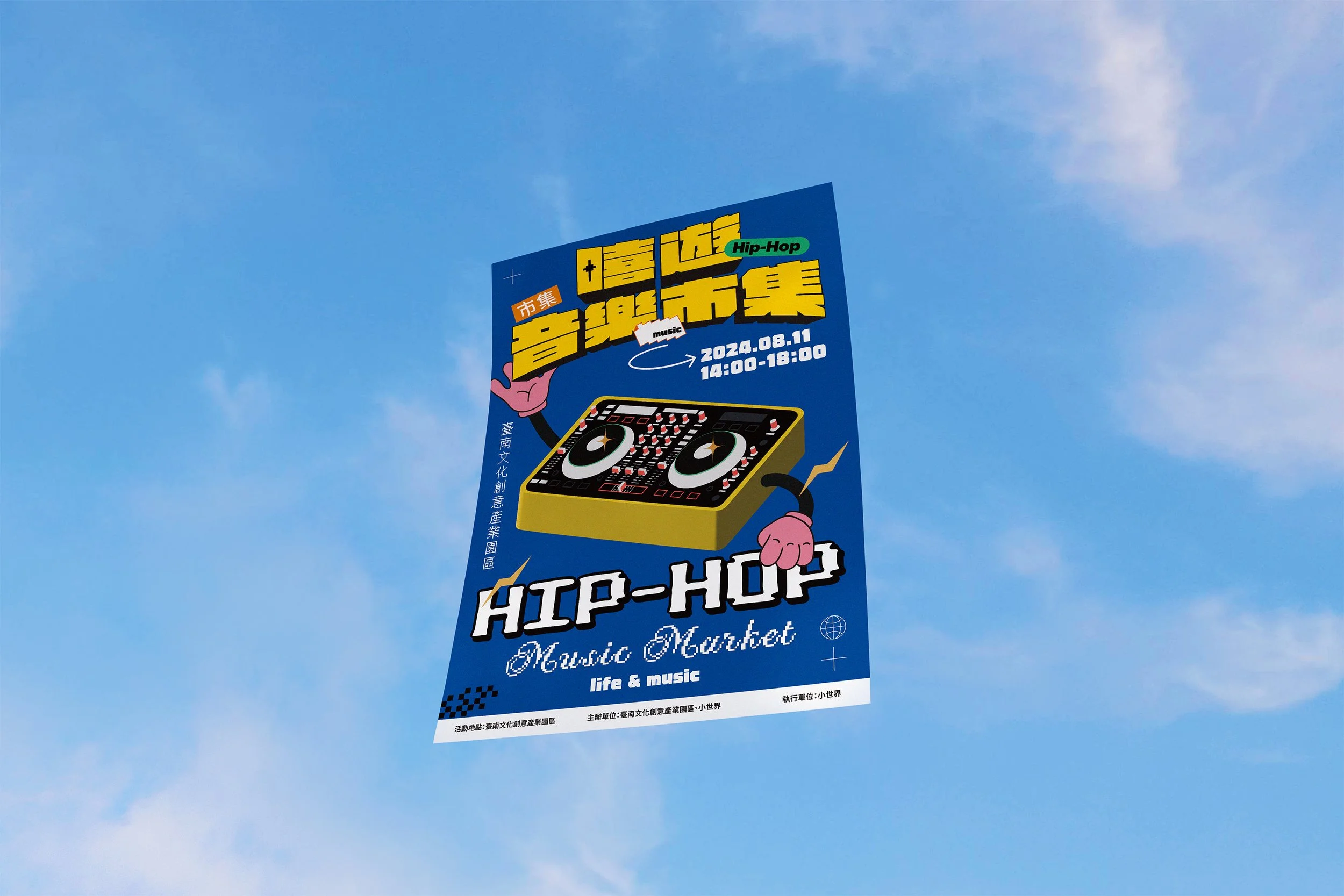 Blue promotional banner advertising an Hip-Hop music market event with a DJ controller illustration, event date and time, and some Chinese text, flying against a clear sky.